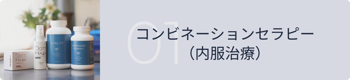 ヘアサイクルの乱れを改善する薬であるフィナステリド、発毛促進薬であるミノキシジル、発毛に関わる全てのシステムに必要不可欠なビタミン、ミネラルを含む高品質なサプリメントを組み合わせた、非常に発毛効果の高い、当クリニックオリジナルの内服治療=コンビネーションセラピーです。