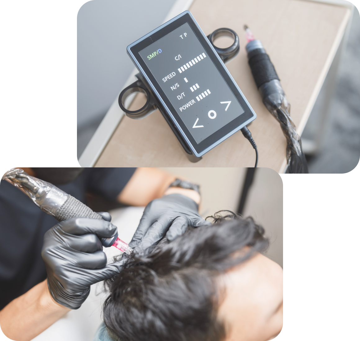 頭皮の透け感が気になる部位へ、毛穴と同じサイズのドット(点)を専用のマシン、色素を用いて皮膚の浅い層に入れていきます。そうすることで頭皮の透け感が解消され、実際に髪の毛が生えているような視覚効果をもたらします。施術直後から変化が実感できるため、内服治療に比べて非常に短期間で薄毛のストレスから解消されます。