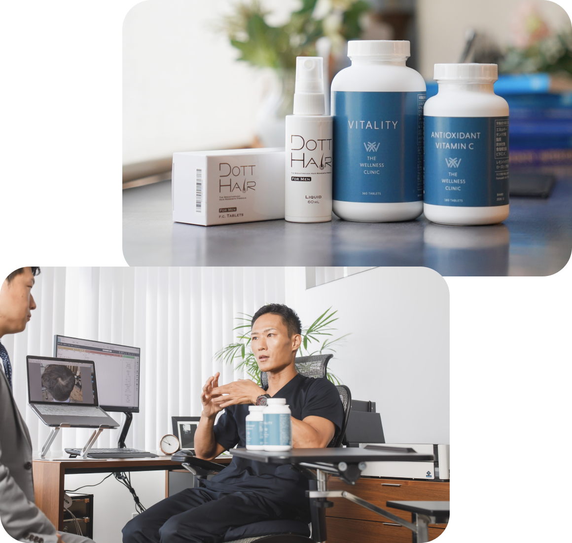 ヘアサイクルの乱れを改善する薬であるフィナステリド、発毛促進薬であるミノキシジル、発毛に関わる全てのシステムに必要不可欠なビタミン、ミネラルを含む高品質なサプリメントを組み合わせた、非常に発毛効果の高い、当クリニックオリジナルの内服治療=コンビネーションセラピーです。